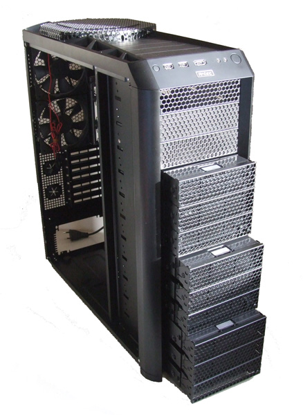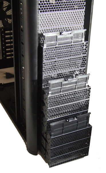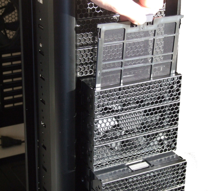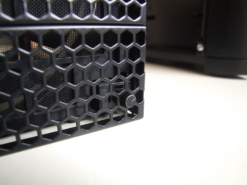Il frontale secondo noi è la parte più riuscita e maggiormente migliorara rispetto al suo predecessore. Gli spigoli frontali ora si raccordano perfettamente con il tetto, la finitura dei materiali da una sensazione di maggior cura sia nella scelta dei materiali sia nel loro assemblaggio. Come per il vecchio modello anche qui troviamo i cassetti estraibili (tre) più uno fisso per un totale di 12 bay da 5,12 per installare indifferentemente unità ottiche o dischi rigidi grazie agli adattatori da 3,14. In questa rivisitazione sono stati apportati importanti miglioramenti, uno su tutti è la presenza di una cornice porta filtro contro la polvere estraibile e lavabile. All'interno di ogni cassetto troviamo una ventola da 120x120mm con un potenziometro per modificarne la velocità sulla parte anteriore nell'angolo in basso a destra di ogni cassetto.