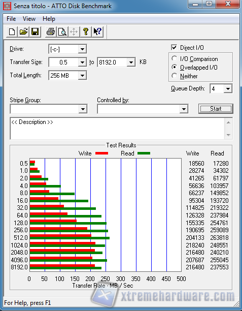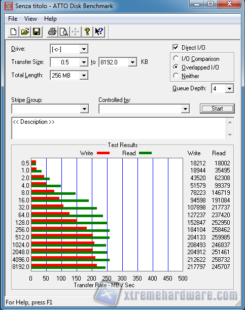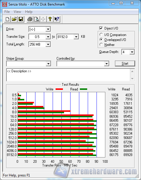 Atto è un benchmark gratuito che esegue dei semplici test in lettura e in scrittura in modalità sequenziale adoperando una Queue Depth (file in coda) di 4.